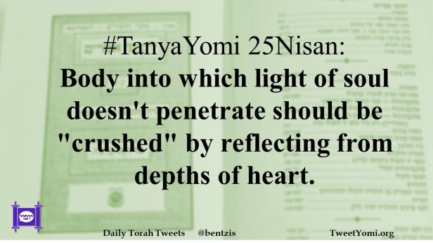 TanyaYomi #TanyaYomi 25Nisan Date: April 18, 2023Author: netanelspitz #TanyaYomi 25Nisan: Body into which light of soul doesn’t penetrate should be “crushed” by reflecting from depths of heart. Share this: Share on X (Opens in new window) X Share on Facebook (Opens in new window) Facebook Like Loading... Related