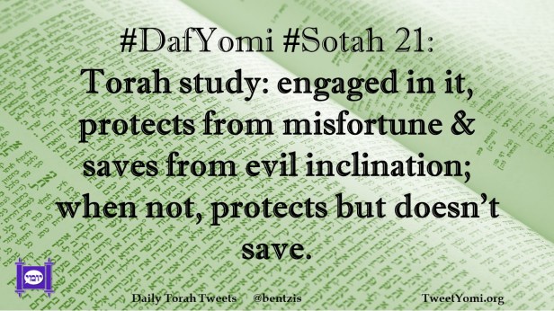 DafYomi, Sotah #DafYomi #Sotah 21 Date: April 20, 2023Author: netanelspitz #DafYomi #Sotah 21: Torah study: engaged in it, protects from misfortune & saves from evil inclination; when not, protects but doesn’t save. Share this: Share on X (Opens in new window) X Share on Facebook (Opens in new window) Facebook Like Loading... Related