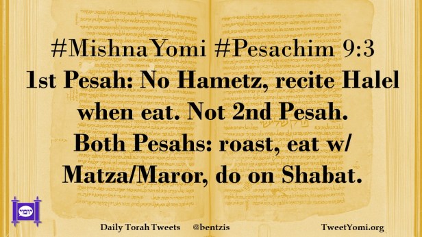 #MishnaYomi #Pesachim 9:3 1st Pesah: No Hametz, recite Halel when eat. Not 2nd Pesah. Both Pesahs: roast, eat w/ Matza/Maror, do on Shabat.