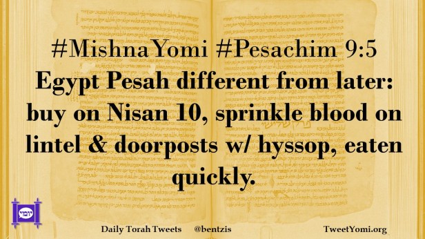 #MishnaYomi #Pesachim 9:5 Egypt Pesah different from later: buy on Nisan 10, sprinkle blood on lintel & doorposts w/ hyssop, eaten quickly.