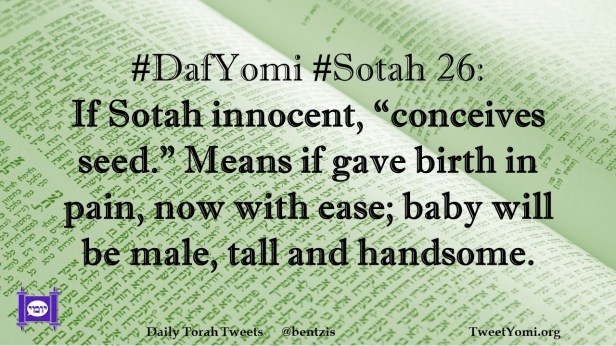 DafYomi, Sotah #DafYomi #Sotah 26 Date: April 25, 2023Author: netanelspitz #DafYomi #Sotah 26: If Sotah innocent, “conceives seed.” Means if gave birth in pain, now with ease; baby will be male, tall and handsome. Share this: Share on X (Opens in new window) X Share on Facebook (Opens in new window) Facebook Like Loading... Related