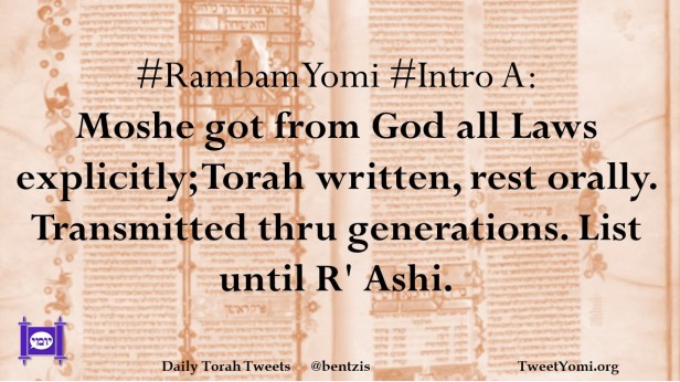 #RambamYomi #Intro A: Moshe got from God all Laws explicitly; Torah written, rest orally. Transmitted thru generations. List until R’ Ashi.