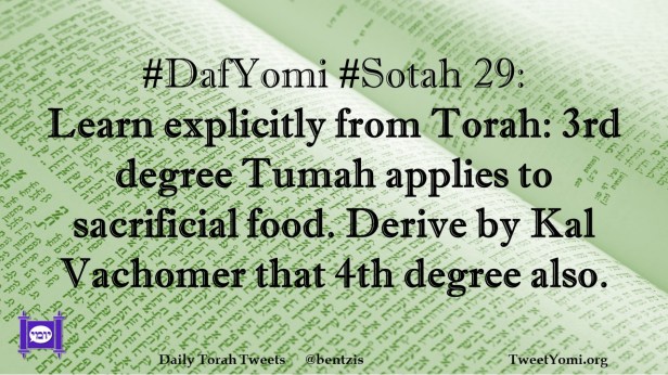 DafYomi, Sotah #DafYomi #Sotah 29 Date: April 30, 2023Author: netanelspitz #DafYomi #Sotah 29: Learn explicitly from Torah: 3rd degree Tumah applies to sacrificial food. Derive by Kal Vachomer that 4th degree also. Share this: Share on X (Opens in new window) X Share on Facebook (Opens in new window) Facebook Like Loading... Related