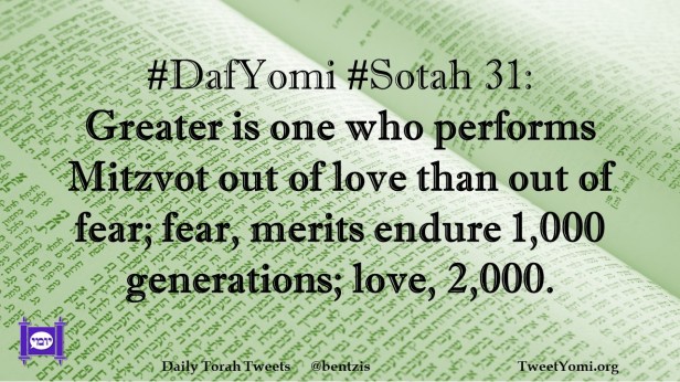 DafYomi, Sotah #DafYomi #Sotah 31 Date: April 30, 2023Author: netanelspitz #DafYomi #Sotah 31: Greater is one who performs Mitzvot out of love than out of fear; fear, merits endure 1,000 generations; love, 2,000. Share this: Share on X (Opens in new window) X Share on Facebook (Opens in new window) Facebook Like Loading... Related