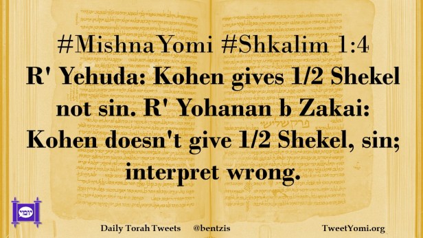 #MishnaYomi #Shkalim 1:4 R’ Yehuda: Kohen gives 1/2 Shekel not sin. R’ Yohanan b Zakai: Kohen doesn’t give 1/2 Shekel, sin; interpret wrong.
