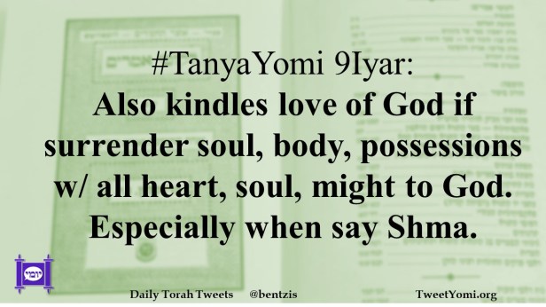 #TanyaYomi 9Iyar: Also kindles love of God if surrender soul, body, possessions w/ all heart, soul, might to God. Especially when say Shma.