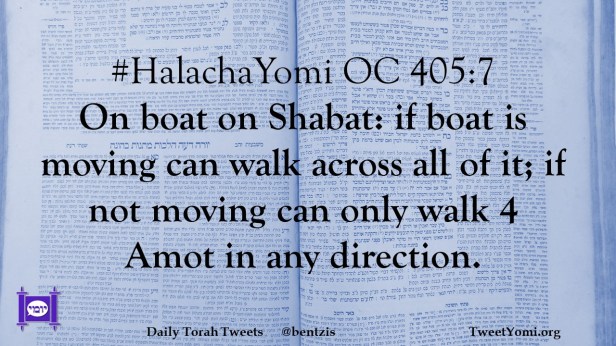 #HalachaYomi OC 405:7 On boat on Shabat: if boat is moving can walk across all of it; if not moving can only walk 4 Amot in any direction.
