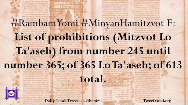 #RambamYomi #MinyanHamitzvot F: List of prohibitions (Mitzvot Lo Ta’aseh) from number 245 until number 365; of 365 Lo Ta’aseh; of 613 total.