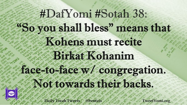DafYomi, Sotah #DafYomi #Sotah 38 Date: May 7, 2023Author: netanelspitz #DafYomi #Sotah 38: “So you shall bless” means that Kohens must recite Birkat Kohanim face-to-face w/ congregation. Not towards their backs. Share this: Share on X (Opens in new window) X Share on Facebook (Opens in new window) Facebook Like Loading... Related