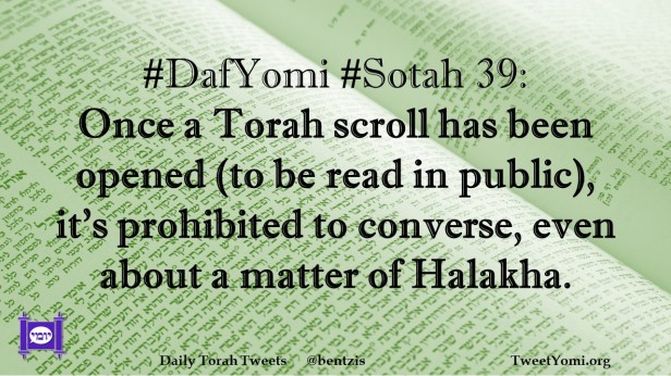 DafYomi, Sotah #DafYomi #Sotah 39 Date: May 7, 2023Author: netanelspitz #DafYomi #Sotah 39: Once a Torah scroll has been opened (to be read in public), it’s prohibited to converse, even about a matter of Halakha. Share this: Share on X (Opens in new window) X Share on Facebook (Opens in new window) Facebook Like Loading... Related