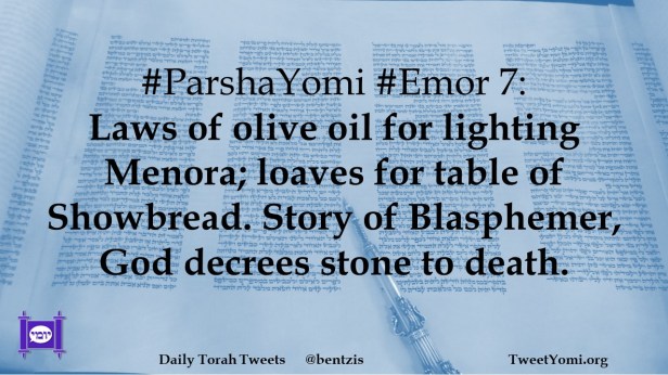 #ParshaYomi #Emor 7: Laws of olive oil for lighting Menora; loaves for table of Showbread. Story of Blasphemer, God decrees stone to death.