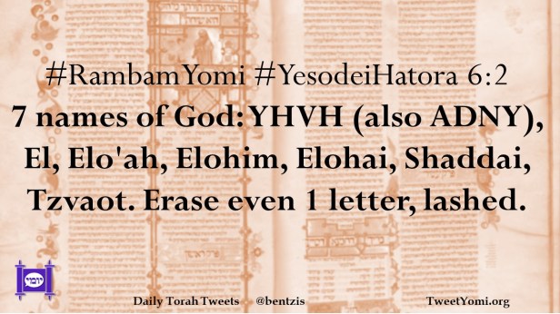 #RambamYomi #YesodeiHatora 6:2 7 names of God: YHVH (also ADNY), El, Elo’ah, Elohim, Elohai, Shaddai, Tzvaot. Erase even 1 letter, lashed.