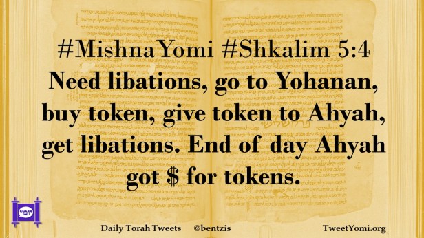 #MishnaYomi #Shkalim 5:4 Need libations, go to Yohanan, buy token, give token to Ahyah, get libations. End of day Ahyah got $ for tokens.