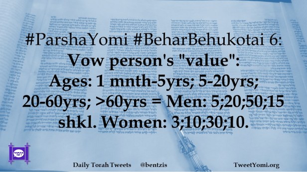 #ParshaYomi #BeharBehukotai 6: Vow person’s “value”: Ages: 1 mnth-5yrs; 5-20yrs; 20-60yrs; >60yrs = Men: 5;20;50;15 shkl. Women: 3;10;30;10.