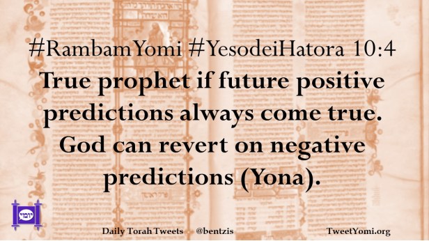 #RambamYomi #YesodeiHatora 10:4 True prophet if future positive predictions always come true. God can revert on negative predictions (Yona).