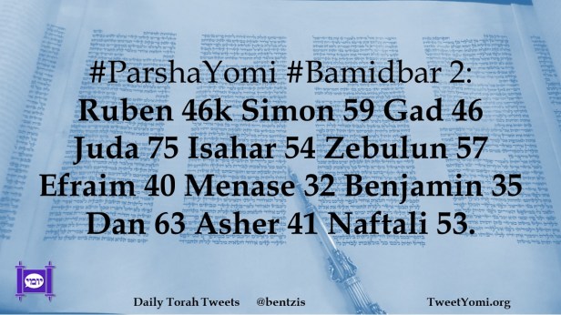 #ParshaYomi #Bamidbar 2: Ruben 46k Simon 59 Gad 46 Juda 75 Isahar 54 Zebulun 57 Efraim 40 Menase 32 Benjamin 35 Dan 63 Asher 41 Naftali 53.