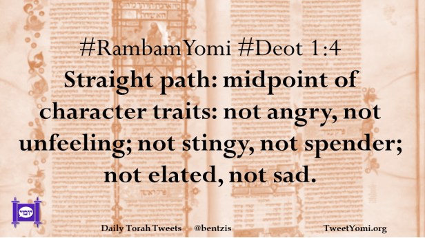 #RambamYomi #Deot 1:4 Straight path: midpoint of character traits: not angry, not unfeeling; not stingy, not spender; not elated, not sad.
