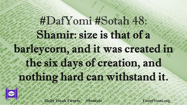DafYomi, Sotah #DafYomi #Sotah 48 Date: May 17, 2023Author: netanelspitz #DafYomi #Sotah 48: Shamir: size is that of a barleycorn, and it was created in the six days of creation, and nothing hard can withstand it. Share this: Share on X (Opens in new window) X Share on Facebook (Opens in new window) Facebook Like Loading... Related
