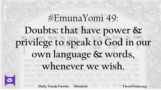 EmunaYomi #EmunaYomi 49 Date: May 17, 2023Author: netanelspitz #EmunaYomi 49: Doubts: that have power & privilege to speak to God in our own language & words, whenever we wish. Share this: Share on X (Opens in new window) X Share on Facebook (Opens in new window) Facebook Like Loading... Related