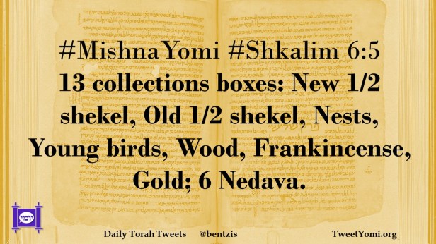 #MishnaYomi #Shkalim 6:5 13 collections boxes: New 1/2 shekel, Old 1/2 shekel, Nests, Young birds, Wood, Frankincense, Gold; 6 Nedava.