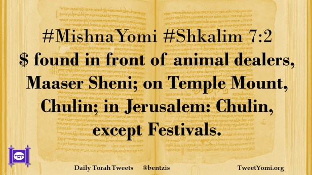 #MishnaYomi #Shkalim 7:2 $ found in front of animal dealers, Maaser Sheni; on Temple Mount, Chulin; in Jerusalem: Chulin, except Festivals.