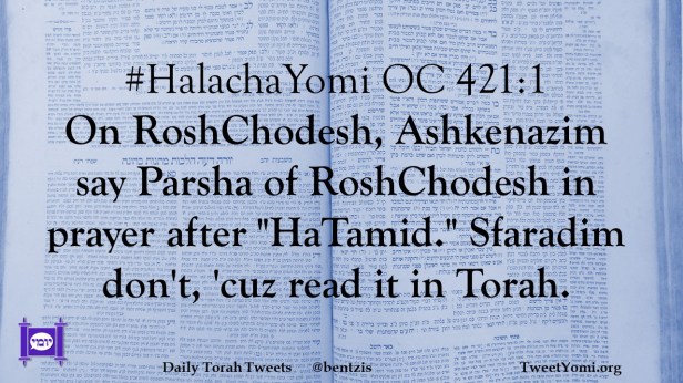 #HalachaYomi OC 421:1 On RoshChodesh, Ashkenazim say Parsha of RoshChodesh in prayer after “HaTamid.” Sfaradim don’t, ‘cuz read it in Torah.