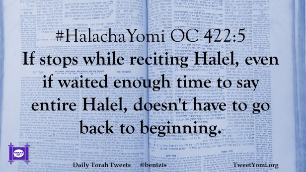 #HalachaYomi OC 422:5 If stops while reciting Halel, even if waited enough time to say entire Halel, doesn’t have to go back to beginning.