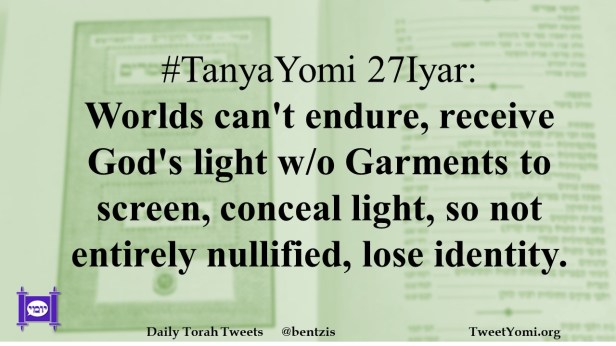 #TanyaYomi 27Iyar: Worlds can’t endure, receive God’s light w/o Garments to screen, conceal light, so not entirely nullified, lose identity.