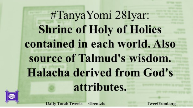 #TanyaYomi 28Iyar: Shrine of Holy of Holies contained in each world. Also source of Talmud’s wisdom. Halacha derived from God’s attributes.
