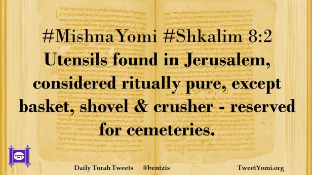 #MishnaYomi #Shkalim 8:2 Utensils found in Jerusalem, considered ritually pure, except basket, shovel & crusher – reserved for cemeteries.