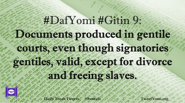 DafYomi, Gitin #DafYomi #Gitin 9 Date: May 25, 2023Author: netanelspitz #DafYomi #Gitin 9: Documents produced in gentile courts, even though signatories gentiles, valid, except for divorce and freeing slaves. Share this: Share on X (Opens in new window) X Share on Facebook (Opens in new window) Facebook Like Loading... Related