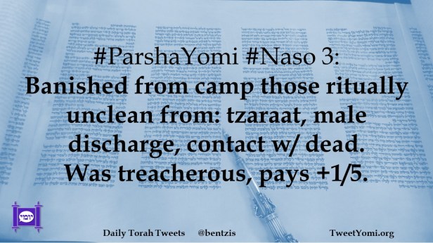 #ParshaYomi #Naso 3: Banished from camp those ritually unclean from: tzaraat, male discharge, contact w/ dead. Was treacherous, pays +1/5.