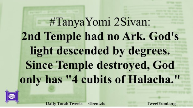 #TanyaYomi 2Sivan: 2nd Temple had no Ark. God’s light descended by degrees. Since Temple destroyed, God only has “4 cubits of Halacha.”