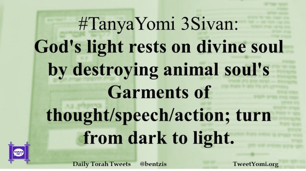 #TanyaYomi 3Sivan: God’s light rests on divine soul by destroying animal soul’s Garments of thought/speech/action; turn from dark to light.