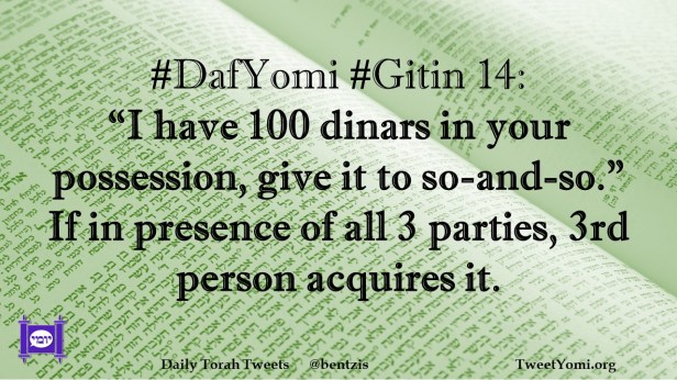 DafYomi, Gitin #DafYomi #Gitin 14 Date: May 30, 2023Author: netanelspitz #DafYomi #Gitin 14: “I have 100 dinars in your possession, give it to so-and-so.” If in presence of all 3 parties, 3rd person acquires it. Share this: Share on X (Opens in new window) X Share on Facebook (Opens in new window) Facebook Like Loading... Related