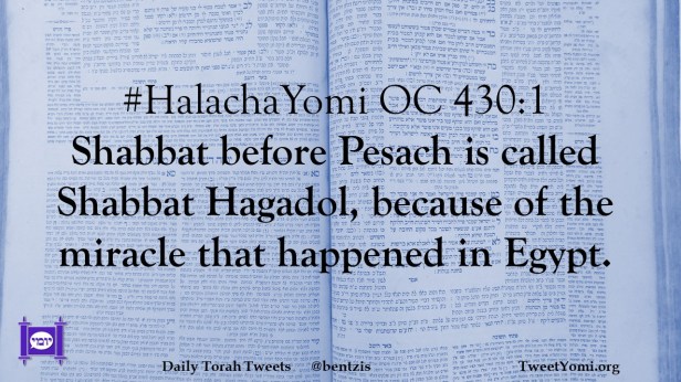 HalachaYomi #HalachaYomi OC 430:1 Date: May 30, 2023Author: netanelspitz #HalachaYomi OC 430:1 Shabbat before Pesach is called Shabbat Hagadol, because of the miracle that happened in Egypt. Share this: Share on X (Opens in new window) X Share on Facebook (Opens in new window) Facebook Like Loading... Related