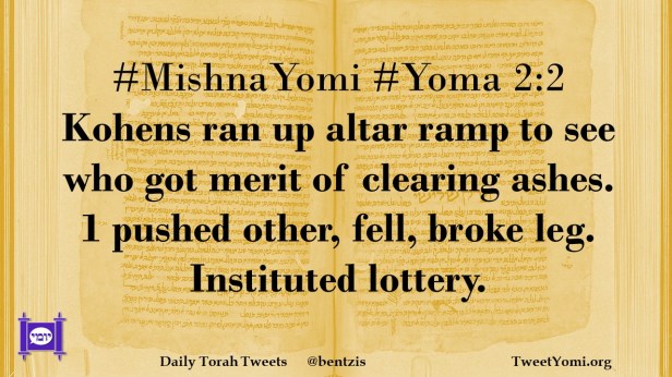 #MishnaYomi #Yoma 2:2 Kohens ran up altar ramp to see who got merit of clearing ashes. 1 pushed other, fell, broke leg. Instituted lottery.