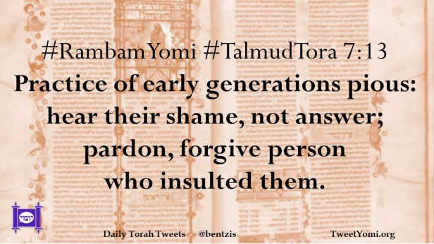 #RambamYomi #TalmudTora 7:13 Practice of early generations pious: hear their shame, not answer; pardon, forgive person who insulted them.