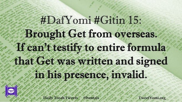 DafYomi, Gitin DafYomi #Gitin 15 Date: June 1, 2023Author: netanelspitz DafYomi #Gitin 15: Brought Get from overseas. If can’t testify to entire formula that Get was written and signed in his presence, invalid. Share this: Share on X (Opens in new window) X Share on Facebook (Opens in new window) Facebook Like Loading... Related
