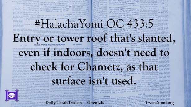 HalachaYomi OC 433:5 Entry or tower roof that’s slanted, even if indoors, doesn’t need to check for Chametz, as that surface isn’t used.