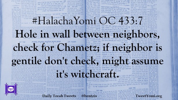 #HalachaYomi OC 433:7 Hole in wall between neighbors, check for Chametz; if neighbor is gentile don’t check, might assume it’s witchcraft.