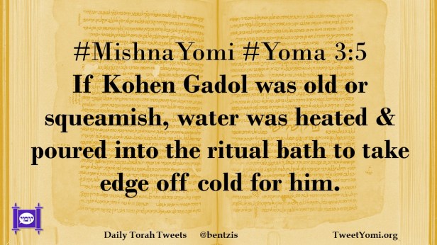 #MishnaYomi #Yoma 3:5 If Kohen Gadol was old or squeamish, water was heated & poured into the ritual bath to take edge off cold for him.