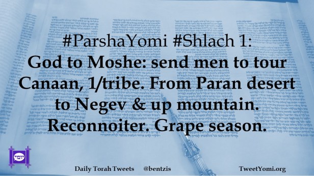 #ParshaYomi #Shlach 1: God to Moshe: send men to tour Canaan, 1/tribe. From Paran desert to Negev & up mountain. Reconnoiter. Grape season.