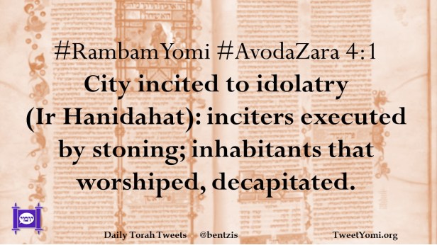 #RambamYomi #AvodaZara 4:1 City incited to idolatry (Ir Hanidahat): inciters executed by stoning; inhabitants that worshiped, decapitated.