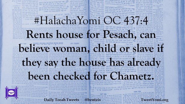#HalachaYomi OC 437:4 Rents house for Pesach, can believe woman, child or slave if they say the house has already been checked for Chametz.