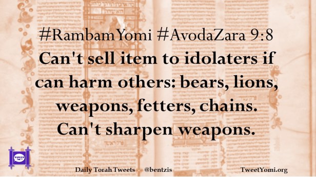 #RambamYomi #AvodaZara 9:8 Can’t sell item to idolaters if can harm others: bears, lions, weapons, fetters, chains. Can’t sharpen weapons.