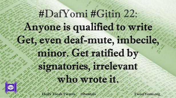 DafYomi, Gitin #DafYomi #Gitin 22 Date: June 13, 2023Author: netanelspitz #DafYomi #Gitin 22: Anyone is qualified to write Get, even deaf-mute, imbecile, minor. Get ratified by signatories, irrelevant who wrote it. Share this: Share on X (Opens in new window) X Share on Facebook (Opens in new window) Facebook Like Loading... Related