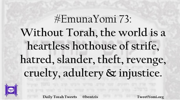 #EmunaYomi 73: Without Torah, the world is a heartless hothouse of strife, hatred, slander, theft, revenge, cruelty, adultery & injustice.