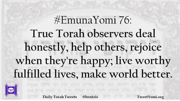 #EmunaYomi 76: True Torah observers deal honestly, help others, rejoice when they’re happy; live worthy fulfilled lives, make world better.