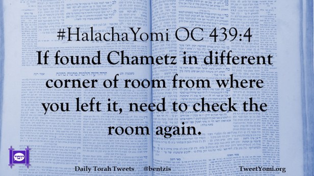 HalachaYomi #HalachaYomi OC 439:4 Date: June 13, 2023Author: netanelspitz #HalachaYomi OC 439:4 If found Chametz in different corner of room from where you left it, need to check the room again. Share this: Share on X (Opens in new window) X Share on Facebook (Opens in new window) Facebook Like Loading... Related